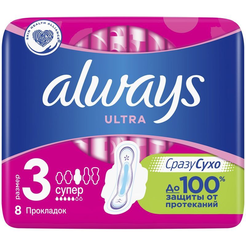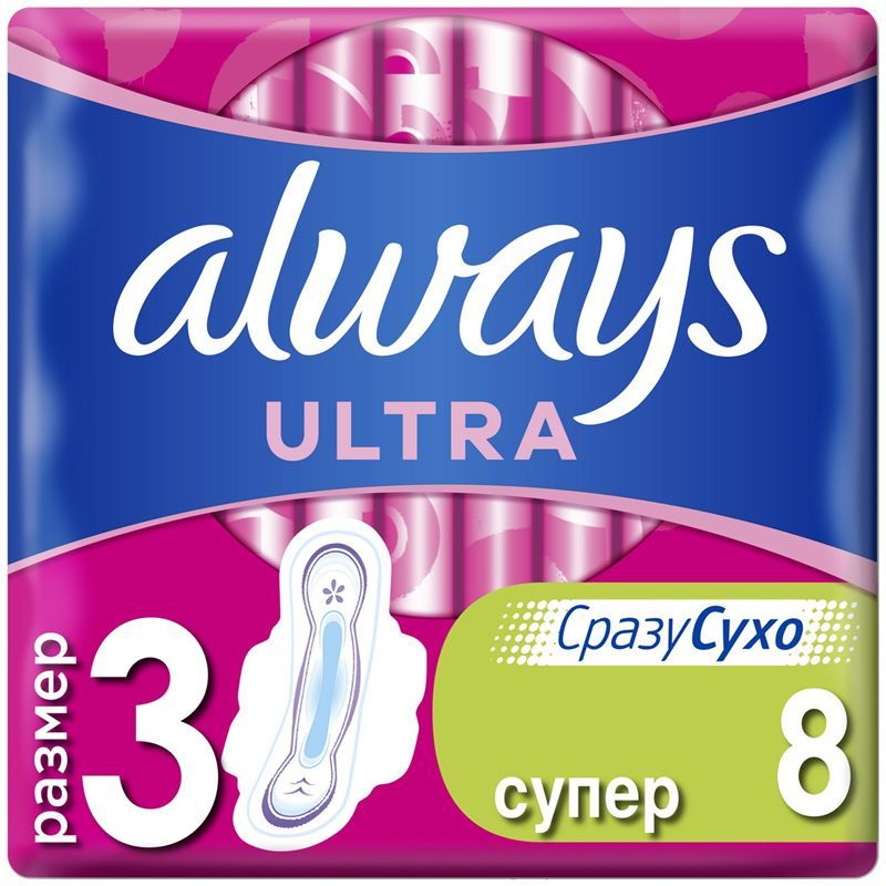 Гигиенические прокладки Always "Ultra Super" (Размер 3) мгновенно впитывают влагу и удерживают ее внутри, обеспечивая до 100 % защиты и уверенности.