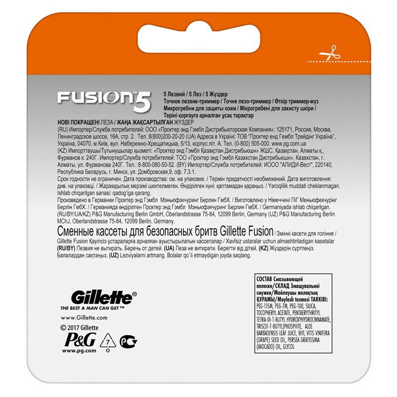 Сменные кассеты для мужской бритвы Gillette Fusion5 с 5 лезвиями с уменьшающим трение покрытием обеспечивают бритье, которое вы едва почувствуете. Точный триммер на обратной стороне удобен для обработки труднодоступных мест, а также для ухода за бородой и усами. Смазывающая полоска-индикатор поблекнет, когда бритва перестанет обеспечивать оптимальный результат бритья. Одной сменной кассеты хватает на один месяц бритья. Сменные кассеты для мужской бритвы Fusion5 подходят ко всем бритвам Fusion5 и Fusion5 Power. Бритвы Gillette, которые раньше назывались Gillette Fusion. Features and Benefits • Бритвы Gillette с 5 лезвиями с покрытием, уменьшающим трение; бритье, которое вы едва почувствуете • Точный триммер на обратной стороне прекрасно подходит для труднодоступных мест (бакенбард и участков кожи над верхней губой) • Со смазывающей полоской-индикатором, которая поблекнет, когда бритва перестанет обеспечивать оптимальный результат бритья • 1 сменной кассеты хватает на месяц бритья • Подходят для всех бритв Fusion5 и Fusion5 Power