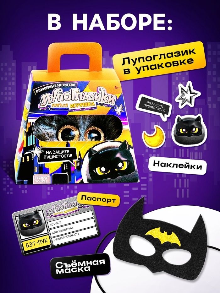 Знакомьтесь — это Бэт-пух. Мягкий супергерой из серии «Лупоглазики. Плюшевые мстители». Мягкая игрушка сочетает пушистый уют и атмосферу приключений. Привлекательный образ делает его отличным компаньоном для детских игр и коллекционирования.