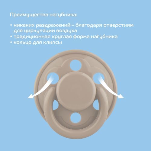 Соска-пустышка с круглым латексным соском предназначена для детей с рождения. Форма нагубника с симметрично расположенными отверстиями обеспечивает свободную циркуляцию воздуха для предотвражения появления опрелостей.Указанный возраст является рекомендованным и зависит от индивидуальных особенностей развития ребенка.