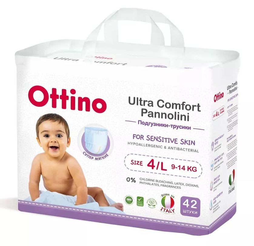 У трусиков-подгузников Ottino удобная Q форма трусиков-подгузников, они самые мягкие в линейке, ультратонкие, суперлегкие, скорость впитывания, высокомолекулярный SAP, подходят и для мальчиков и для девочек, эластичный мягкий поясок, дышащая паропроницаемая пленка, лента утилизации, мягкие боковые бортики, индикатор влажности, многоразовые липучки, премиальные материалы в составе, разработано в Италии.