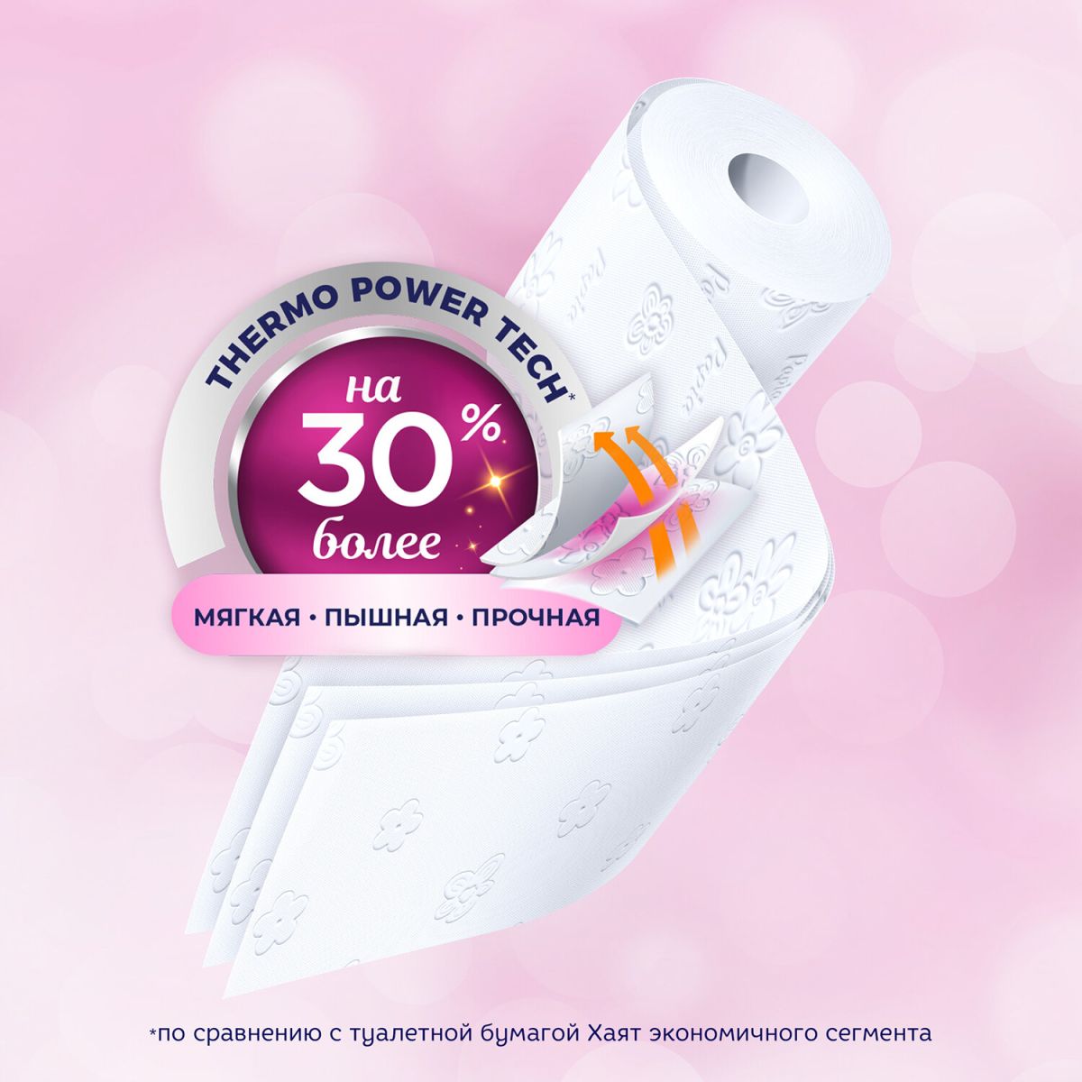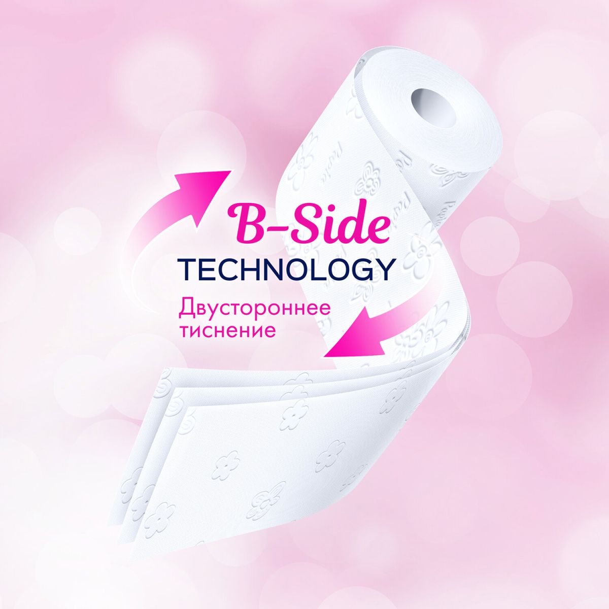 Белая трёхслойная туалетная бумага в рулонах. Нежная текстура с инновационным тиснением и декоративный рисунок придают бумаге особую мягкость и обеспечивают бережный уход за кожей.