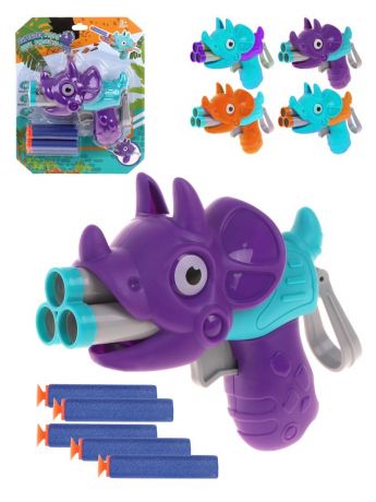 Бластер для мальчика отличается оригинальным дизайном – он выполнен в виде динозавра. Игрушка стреляет софт-патронами. В комплекте прилагается 5 таких патронов с наконечниками-присосками. Патроны поочередно устанавливаются в ствол игрового оружия. Для выстрела из мини-бластера нужно вытянуть рычаг в задней части бластера, прицелиться и нажать на спусковой крючок.