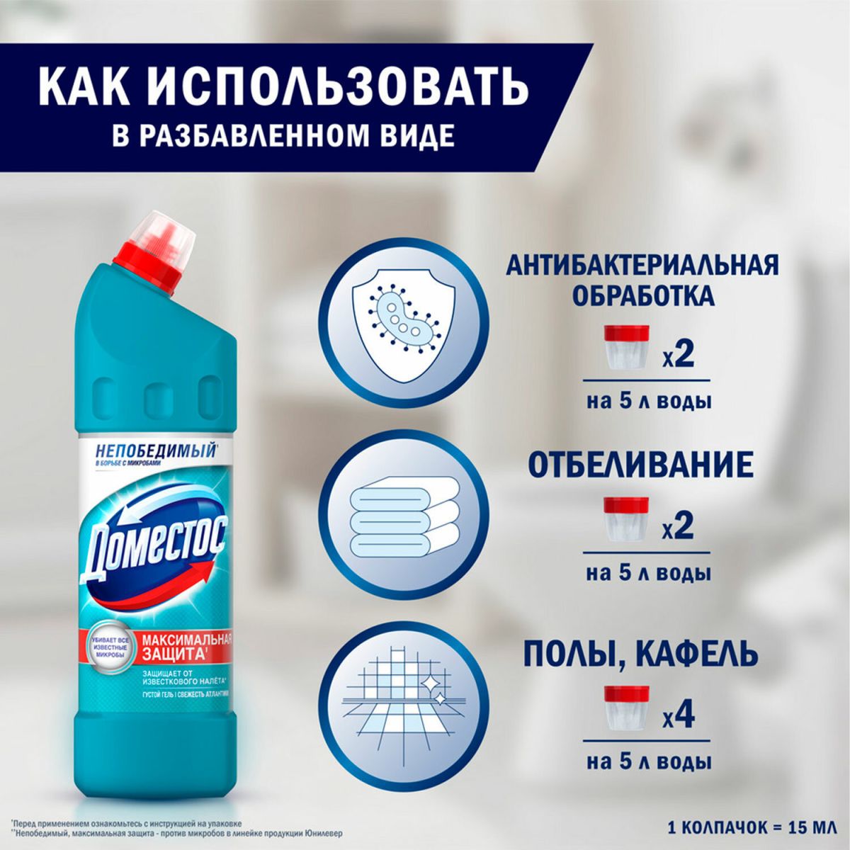 Хотите обеспечить блестящую чистоту и защиту от микробов в доме быстро и надолго? Универсальное средство Domestos Свежесть Атлантики - это эффективный чистящий гель, который уничтожает 100% известных микробов во всем доме для защиты семьи. __Средство Domestos универсально и подойдет для уборки всего дома. В неразбавленном виде средство можно использовать для очищения и дезинфекции унитаза, ванны, раковины, стоков и сливов, а в разбавленном - для мытья множества поверхностей (пол, кафельные поверхности, плитка, рабочие поверхности на кухне, мусорные ведра) и даже для отбеливания белья и тканей. Универсальное средство Domestos подходит для септиков. Ознакомьтесь с инструкцией по применению для каждого вида поверхностей.__Благодаря особой формуле с дезинфицирующим эффектом и чистящими компонентами, Domestos убивает все известные микробы, максимально отчищает грязь и устраняет неприятные запахи. Уникальная формула геля Domestos предотвращает появление известкового налета. Густая текстура геля Domestos обеспечивает гарантированное очищение и убивает бактерии, грибки, вирусы и споры. Изогнутый дозатор обеспечит удобство использования. Регулярно используйте Domestos для постоянной чистоты и белизны туалета и других поверхностей, а также для защиты семьи. __Универсальное средство Domestos экономично и быстро обеспечивает длительное действие и защиту. Тысячи лабораторных тестов каждую неделю подтверждают, Domestos - непобедимый. Безжалостное уничтожение микробов обеспечит дезинфекцию и чистоту в доме. __Состав: не более 5% гипохлорит натрия, анионные ПАВ, неиногенные ПАВ, мыло, отдушка.
