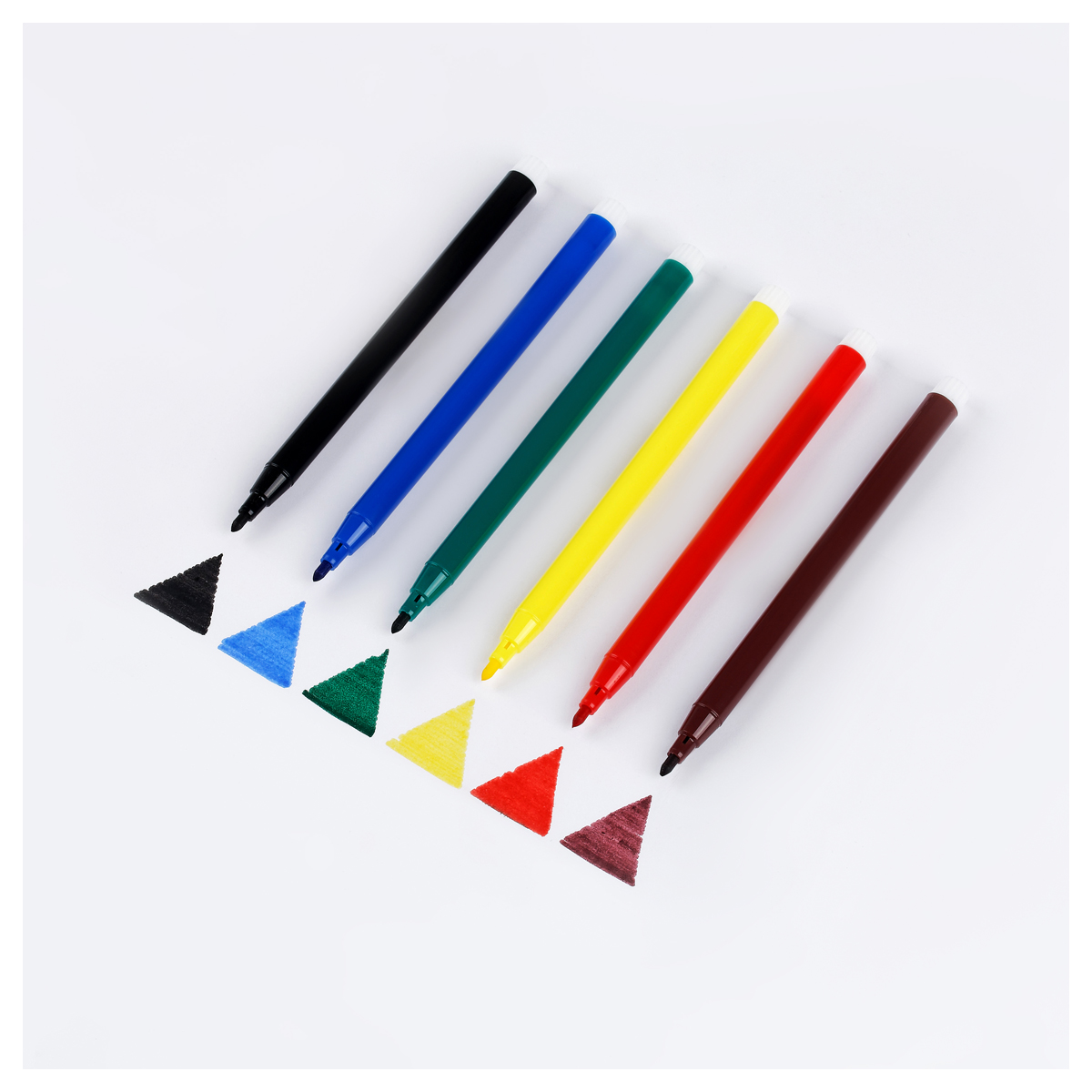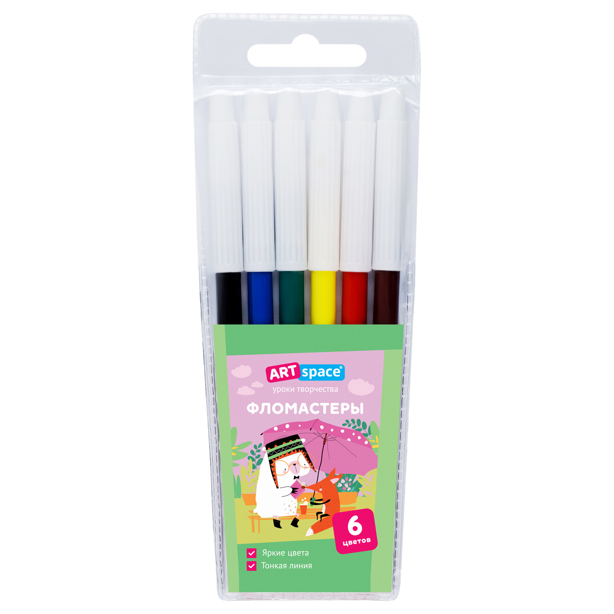 Фломастеры ArtSpace серии «Рассказы» представлены с чернилами ярких цветов и невентилируемым колпачком белого цвета. Толщина линии письма составляет 1,0 мм. В наборе 6 ярких цветов. Тип наконечника – конический. Несмываемые фломастеры на водной основе нетоксичны. Набор фломастеров упакован в ПВХ-пакет с европодвесом и ярким вкладышем.