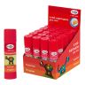 Предназначен для склеивания бумаги (в том числе и фотобумаги), картона, ткани. Не оставляет следов на одежде и легко смывается водой. Клей производится на основе натуральных ингредиентов, не содержит растворителей, поэтому безопасен для детей. Круглый корпус удобно держать в детской руке. Клей поставляется в дисплей-боксах.