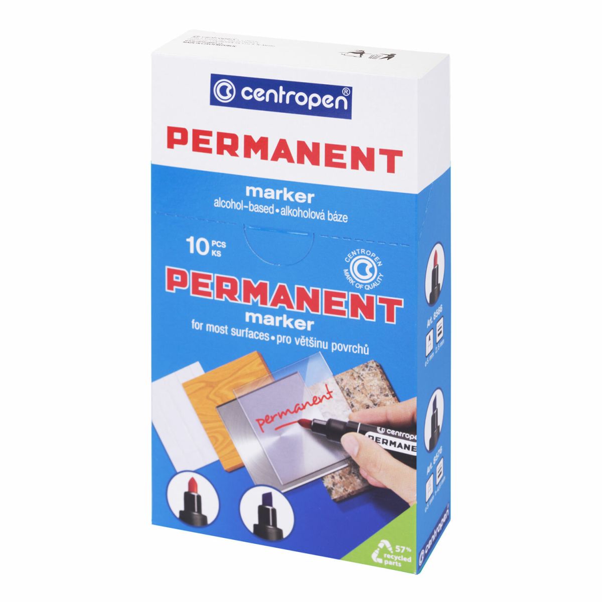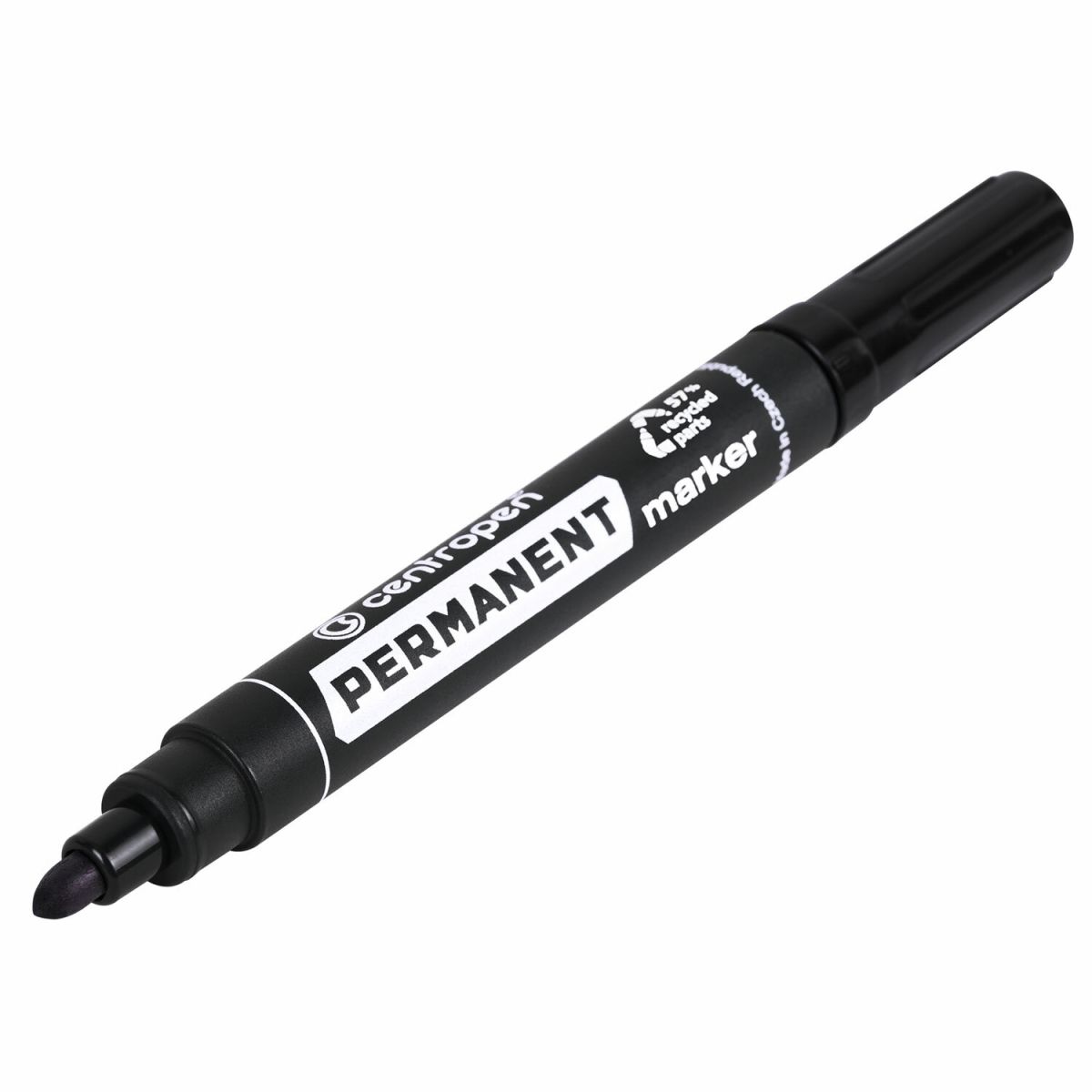 Перманентный маркер на спиртовой основе с закругленным наконечником. Колпачок соответствует цвету чернил. Чернила черного цвета высокой степени светостойкости, термостойкие до 100 градусов.Маркер CENTROPEN поставляется в круглом черном корпусе диаметром 20 мм с деталями в цвет чернил. Проводимая линия письма - 2,5 мм. Хранить с плотно закрытым колпачком в горизонтальном положении.