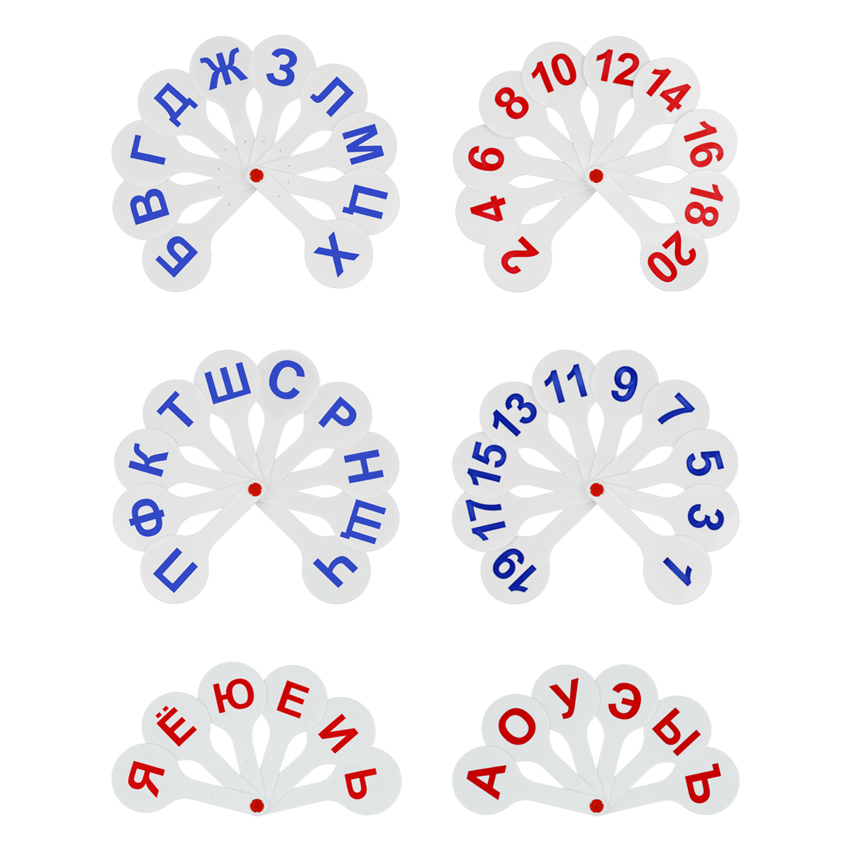Веера с гласными, согласными буквами и цифрами в футляре для хранения. Выполнены из ударопрочного сертифицированного полипропилена, отличаются легкостью. Крупный размер и шрифт, качественная печать, устойчивая к истиранию.