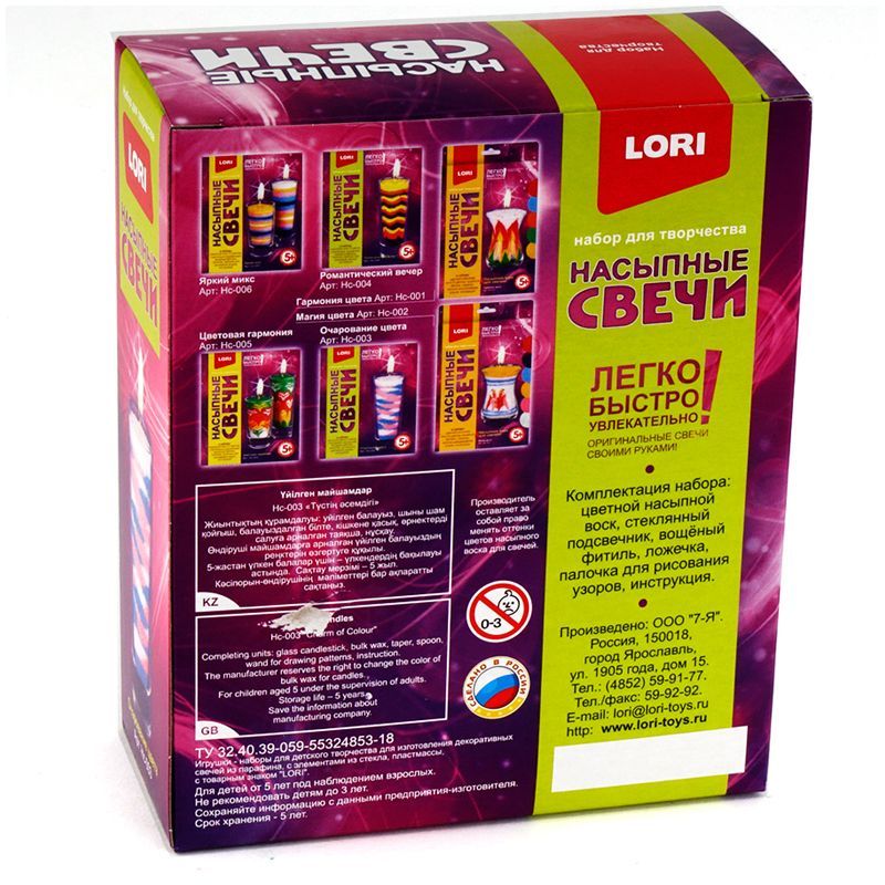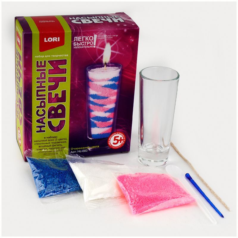 Серия наборов позволит Вам создать оригинальные свечи своими руками из разноцветного насыпного воска. Готовое изделие не только будет предметом декора, но и послужит отличным подарком для друзей и близких. В наборе: цветной насыпной воск (3 цвета), стеклянный подсвечник, вощеный фитиль, ложечка, палочка для рисования узоров, инструкция.