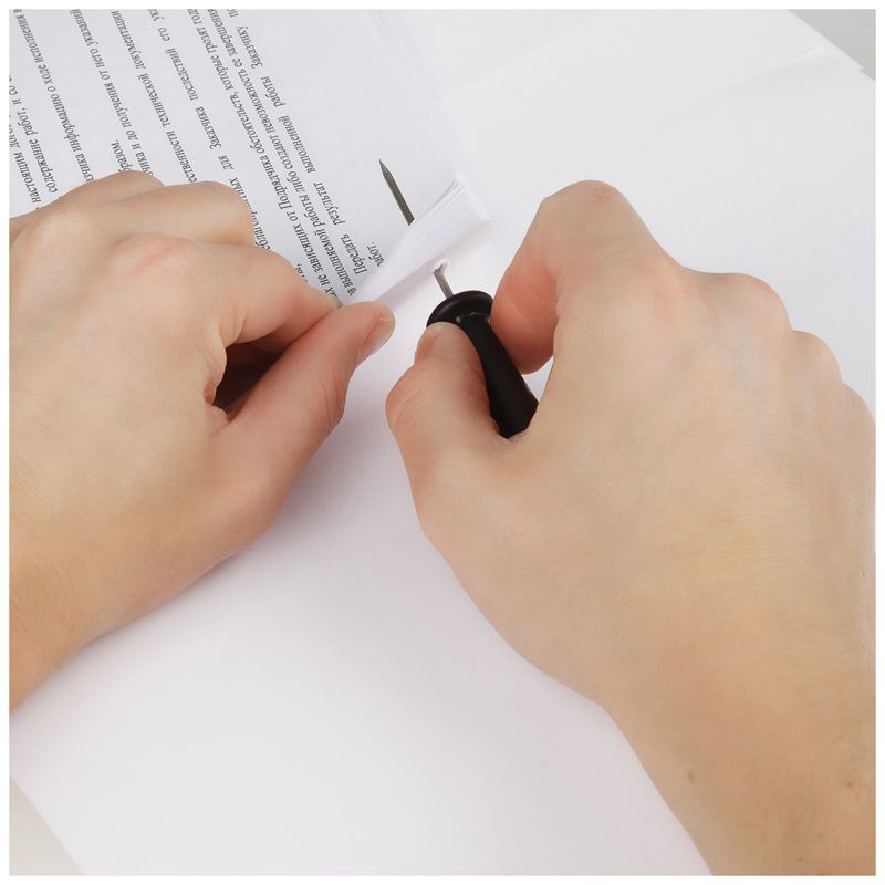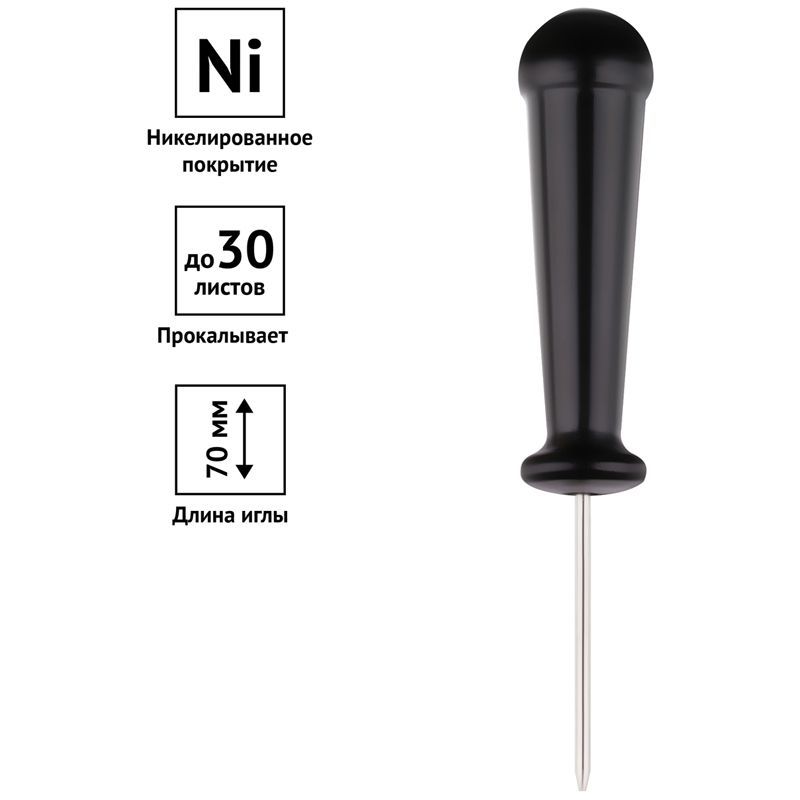 Большое канцелярское шило используется для прошивки документов и прокалывания бумаги. Цвет пластиковой рукоятки - черный. Диаметр шила 3 мм, длиной 70 мм, общая длина шила 150 мм. Имеет никелевое покрытие. Изделие может обеспечить прокалывание до 30 листов бумаги за один прокол.