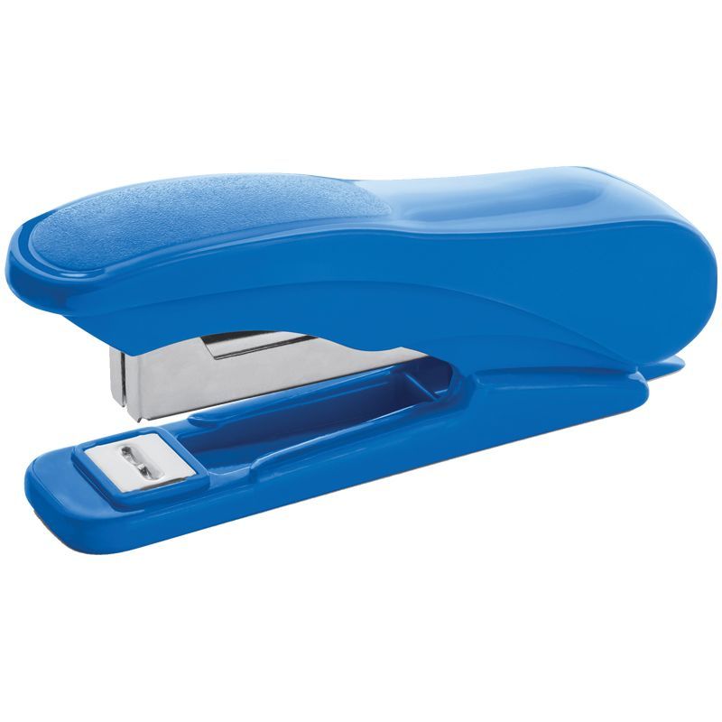Удобный, пластиковый степлер для скоб №10, сшивает до 12 листов, вмещает 50 скоб, есть встроенный антистеплер. Цвет корпуса - синий.