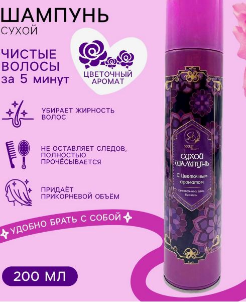 Сухой шампунь Secret Beauty с цветочным ароматом, 200 мл — свежесть, нежность и лёгкий шлейф цветов в одном мгновении.
