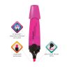 Текстовыделитель розового цвета имеет овальную форму корпуса, диаметр которого 25 мм. Скошенный наконечник имеет толщину линии письма от 1 до 5 мм, что обеспечивает удобство при работе с текстом, напечатанным мелким шрифтом, или таблицами. Благодаря особой водной основе чернил текстовыделитель не высыхает без колпачка в течение 8 часов. Текстовыделитель обладает экономным расходом чернил, при этом длина линии письма достигает 300 метров. Светоустойчивые чернила быстро впитываются, предотвращая размазывание в процессе использования, и не выцветают даже на открытом солнце. Цвет колпачка и корпуса текстовыделителя соответствует цвету чернил.