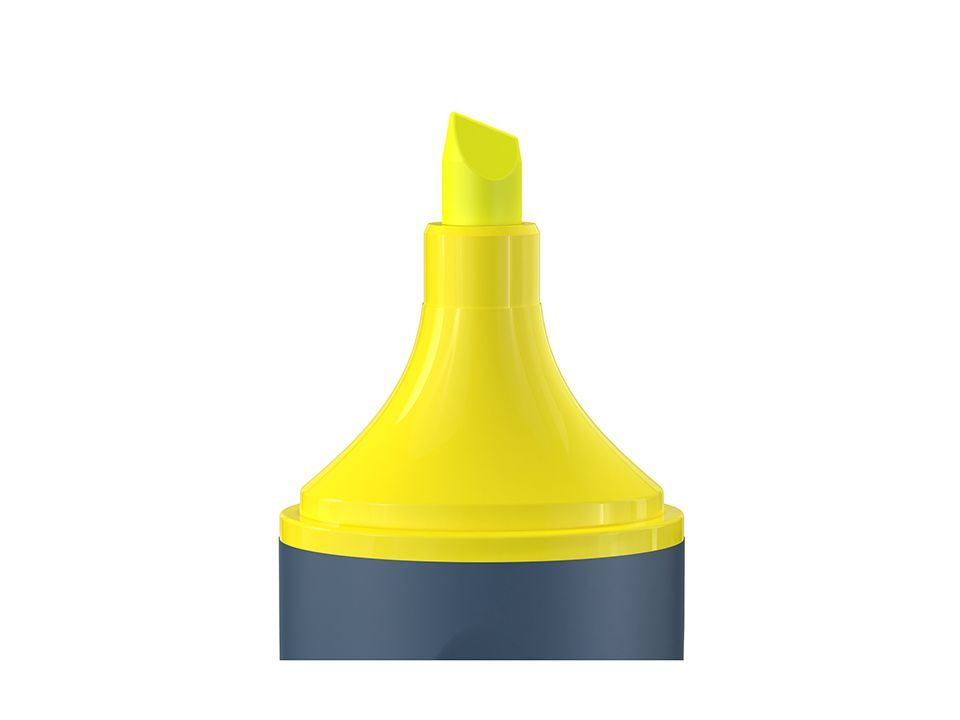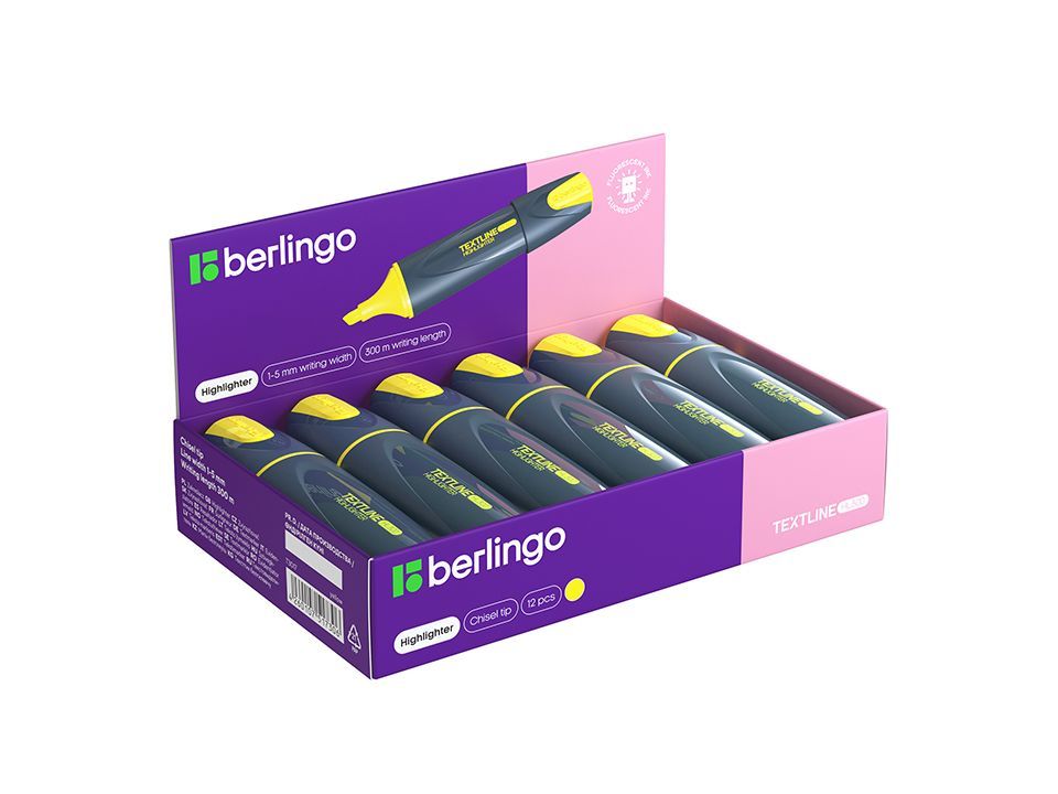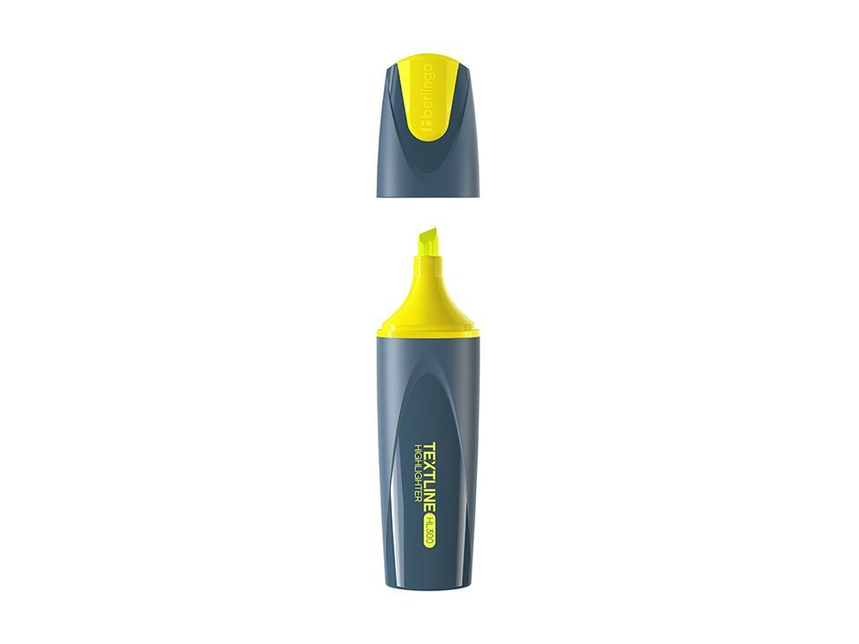Текстовыделители с флуоресцентными чернилами на водной основе. Выполнены в оригинальном корпусе графитового цвета с сочетанием матовых и глянцевых поверхностей. Яркие элементы колпачка и нанесение соответствуют цвету чернил. Длина непрерывной линии письма - 300 метров. Скошенный наконечник с толщиной линии от 1 до 5 мм. Цвет чернил - жёлтый. Упакованы в картонную коробку-дисплей по 12 штук.