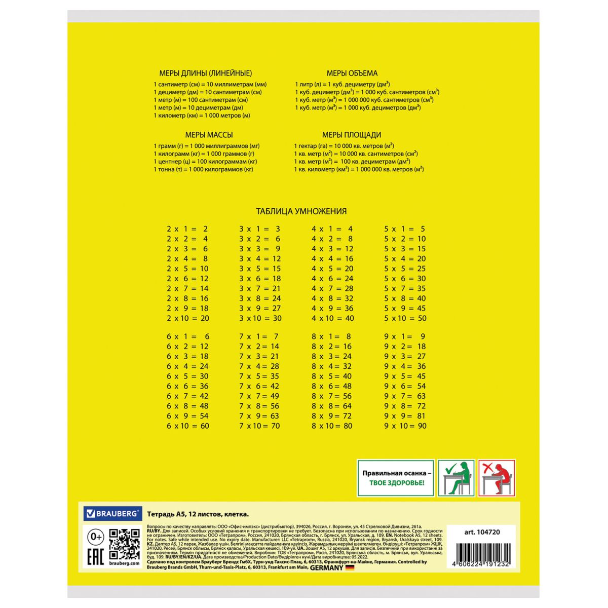 Внутренний блок плотностью 65 г/м2 из офсетной бумаги содержит 12 листов. Линовка - клетка с полями. Обложка изготовлена из импортного мелованного картона. Скрепка надежно скрепляет листы между собой.